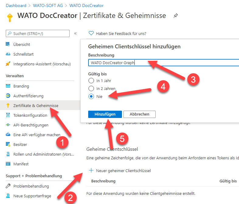 Nun muss noch ein «geheimer Schlüssel» generiert werden. Dazu klicken Sie bitte in der Gruppe «Verwalten» auf die Registerkarte «Zertifikate & Geheimnisse» (1). Nach Klick auf «Neuer geheimer Clientschlüssel» (2) öffnet sich ein Fenster, in dem Sie sowohl die Beschreibung (3) eingeben, als auch die Option «Gültig bis» mit «Nie» (4) anwählen müssen/sollten. Dies bedeutet, dass der «geheime Clientschlüssel» nie abläuft. Mit Klick auf «Hinzufügen» (5) schliessen Sie die Eingabe ab und der «geheime Clientschlüssel» wird generiert
