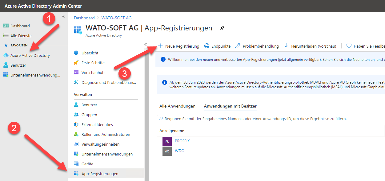 Klicken Sie nun auf Registerkarte «Azure Active Directory» (1), danach in der Gruppe «Verwalten» auf «App-Registrierungen» (2) u. auf den Button «Neue Registrierung» (3)