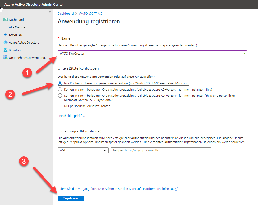 Nach Klick auf «Neue Registrierung» können Sie nun einen Namen für die Anwendung vergeben (1). Ausserdem muss die Option «nur Konten in diesem Organisationsverzeichnis» angewählt werden (2)