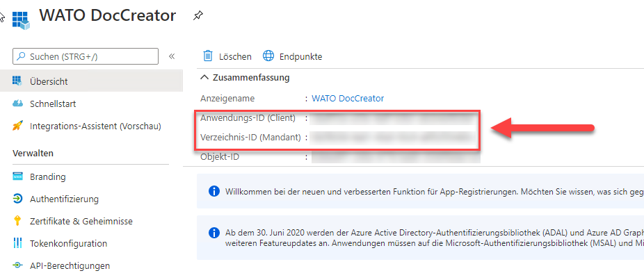 Anwendungs ID: eindeutiger Schlüssel der Anwendung (Client ID) im Azure Portal