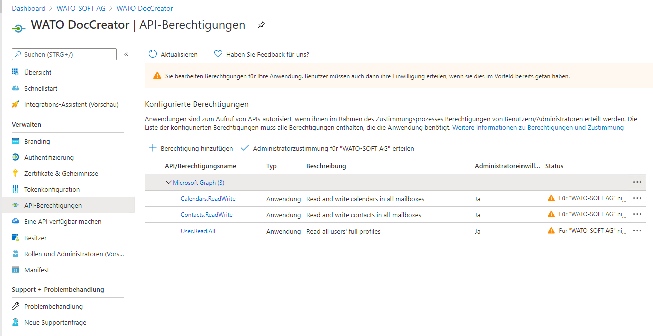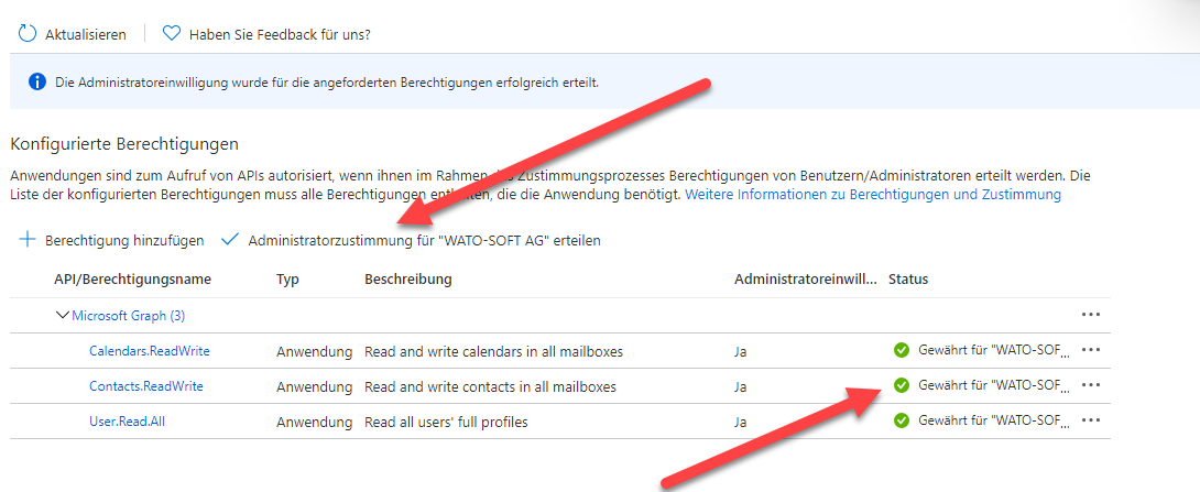 Abschliessend muss nun noch über die Schaltfläche «Administratorzustimmung für …» die entsprechende Zustimmung erteilt werden, womit die Einrichtung der OAuth2-Authentifizierung abgeschlossen ist.