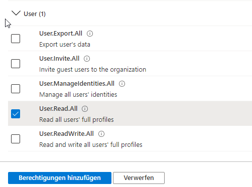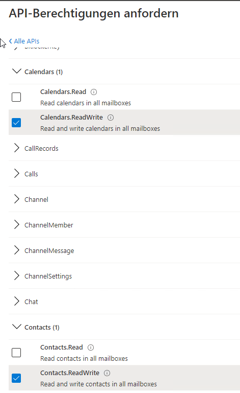 Für die M365-Synchronisation werden im Einzelnen die Berechtigungen «Calendars.ReadWrite», «Contacts.ReadWrite» u. «User.Read» benötigt. Wählen Sie bitte diese drei Berechtigungen aus und bestätigen Sie Ihre Auswahl mit dem Button «Berechtigungen hinzufügen»