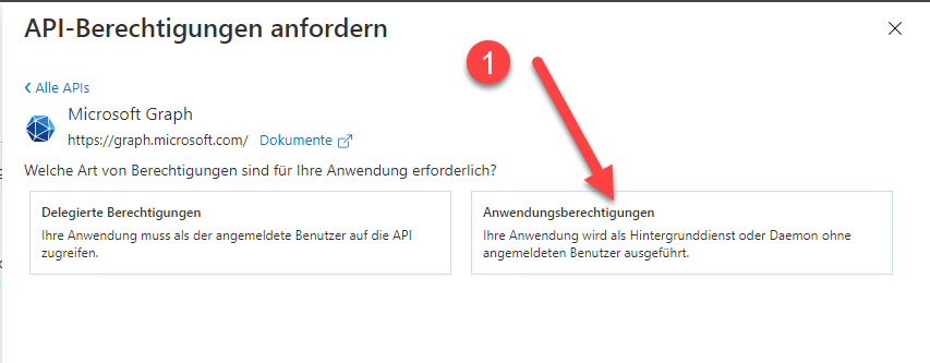 Als «Berechtigungsart» wählen Sie bitte «Anwendungsberechtigung» (1) aus.