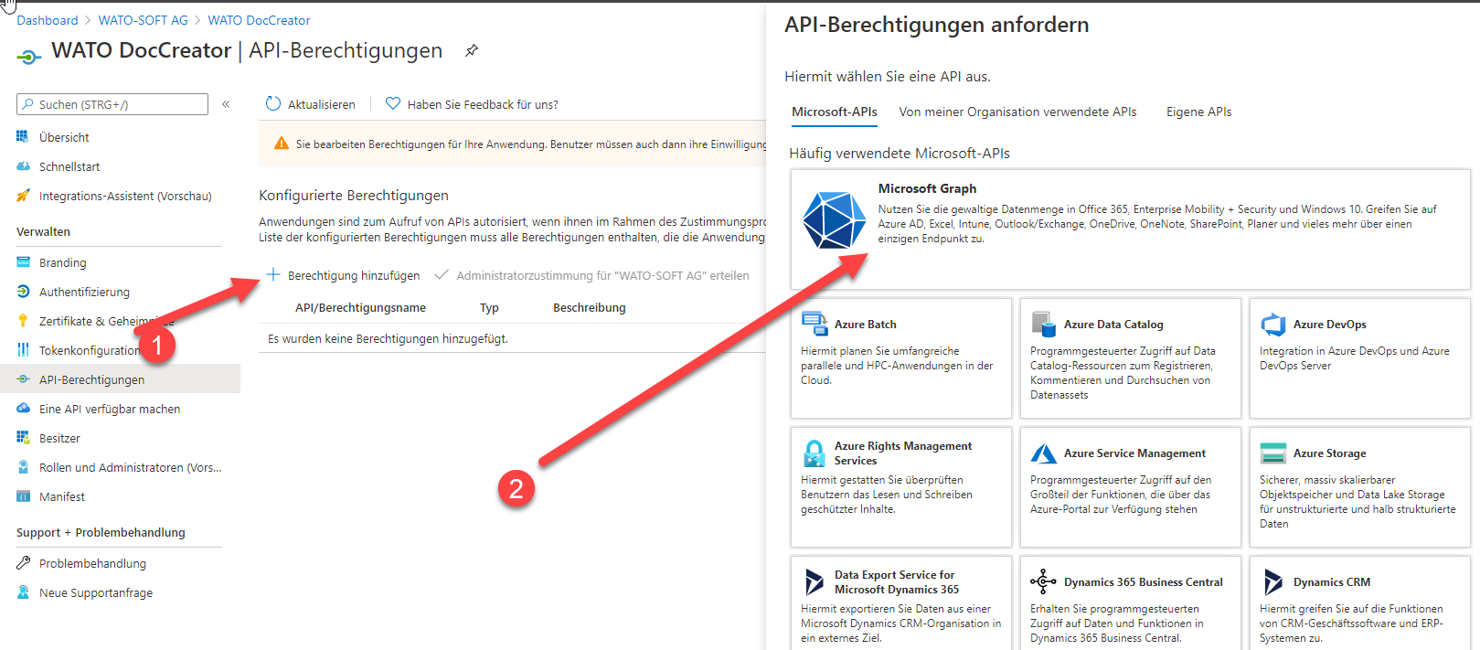 Zur Berechtigungsvergabe in Azure klicken Sie nun in der Gruppe «Verwalten» auf Registerkarte «API-Berechtigungen» und danach auf die Schaltfläche «Berechtigung hinzufügen» (1). Suchen Sie hier nun die API «Microsoft Graph» (2) und wählen diese aus.