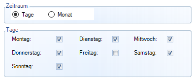 Ein tagesbasierter Zeitplan legt fest, an welchen Tagen der Woche die entsprechende Definition (z.B. ein Export, eine M365-Synchronisation, …) ausgeführt werden soll. Dies wird durch Setzen der Flags an den entsprechenden Tagen festgelegt.