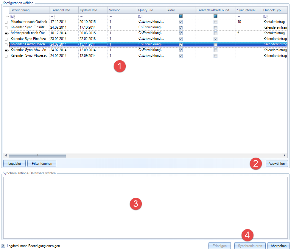 Im oberen Bereich (1) werden alle aktiven M365-Sync.-Definitionen angezeigt. Per Doppelklick auf eine M365-Sync.-Definition oder Markieren u. anschließendem Klick auf «Auswählen» (2) werden alle zur markierten M365-Sync.-Definition vorhandenen, d.h. zu synchronisierenden Datensätze im unteren Bereich (3) angezeigt. Markiert man dort einen oder mehrere Datensätze, so werden diese Dateien nach Klick auf «Synchronisieren» (4) übertragen.