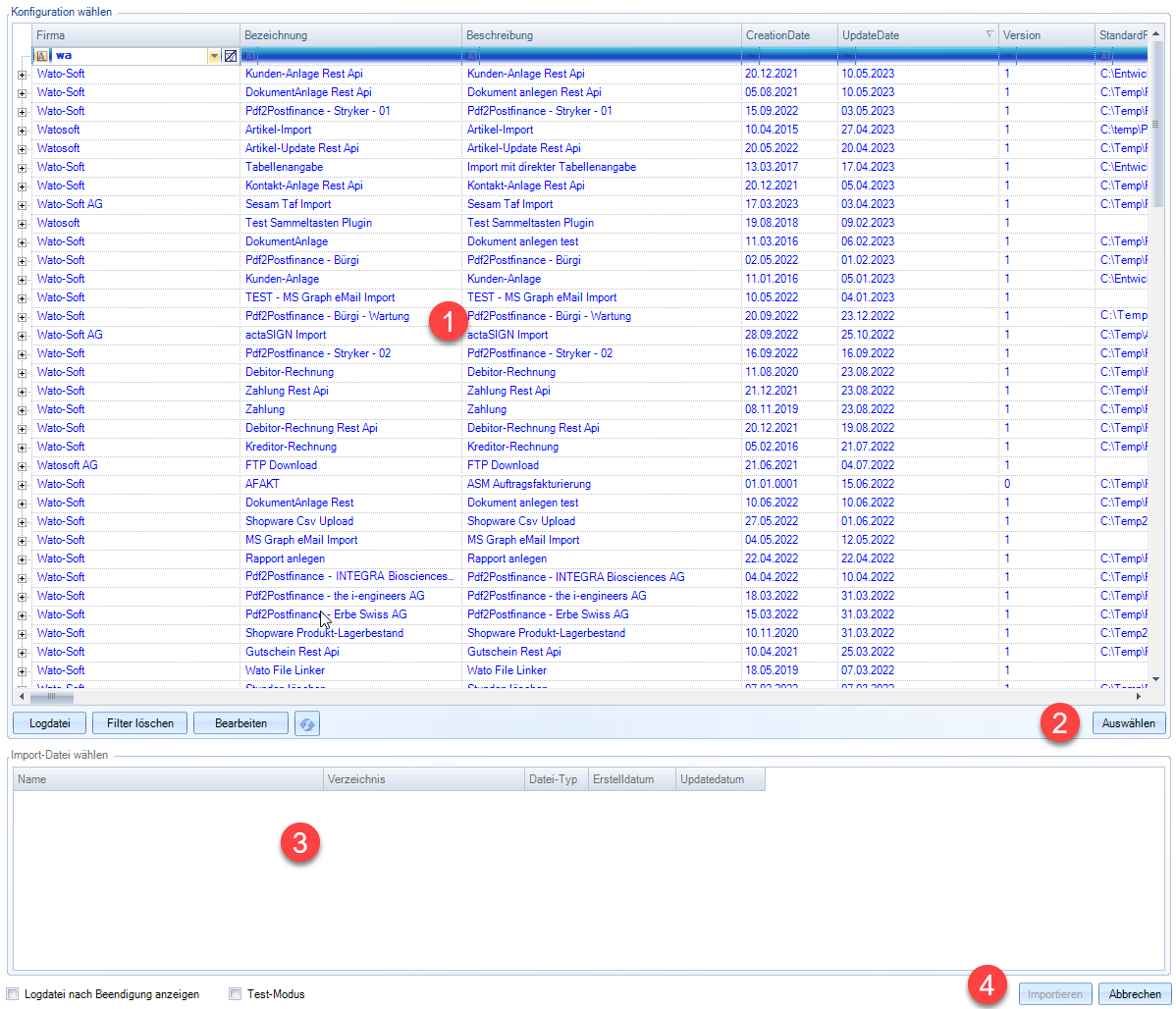 Im oberen Bereich (1) werden alle aktiven Import-Definitionen angezeigt. Per Doppelklick auf eine Import-Definition oder Markieren u. anschließendem Klick auf «Auswählen» (2) werden alle zur markierten Import-Definition vorhandenen, d.h. zu importierenden Dateien im unteren Bereich (3) angezeigt. Markiert man dort eine oder mehrere Einträge, so werden diese Dateien nach Klick auf «Importieren» (4) importiert.