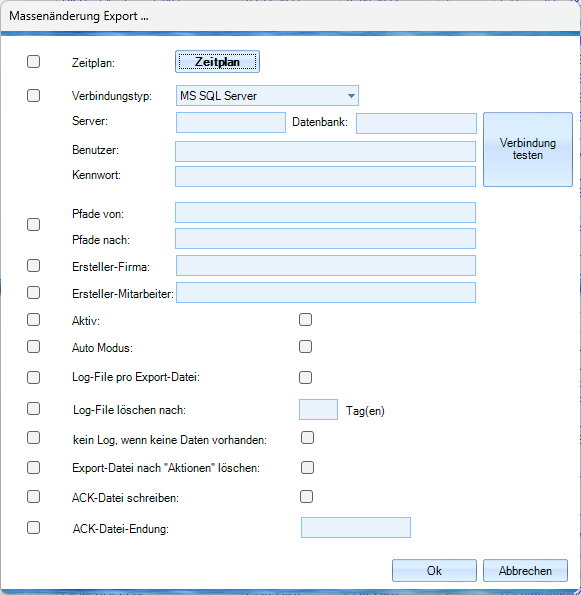 ODBC/Benutzer/Kennwort: hier kann für alle markierten Export-Definitionen die Datenbankverbindung gesetzt/geändert werden