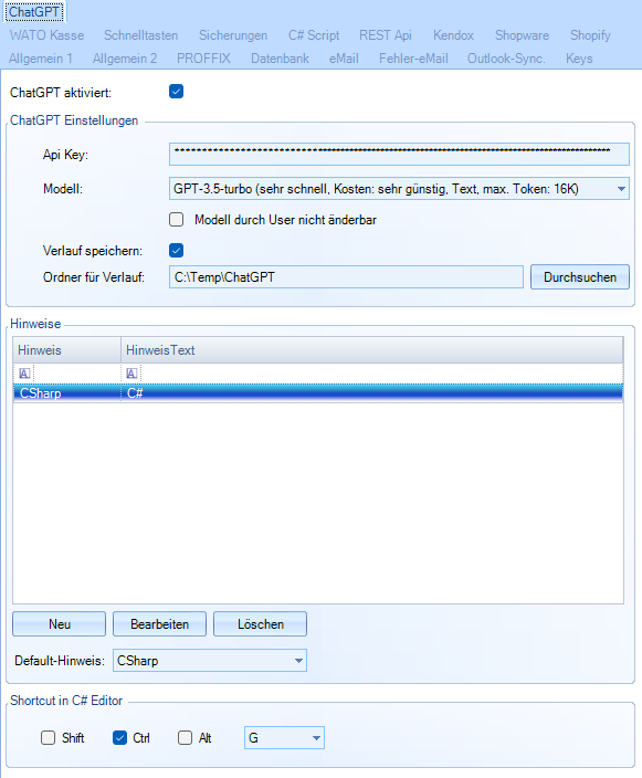 Hinweise: hier lassen sich vordefinierte "Hinweise" definieren, die bei an ChatGPT zur Konkretierung der Anfragen mitgegeben werden