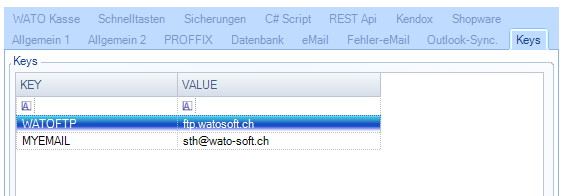 Hier können globale "Key/Value" Paare definiert werden, die an vielen Stellen als Platzhalter eingefügt, sowie in C# Scripten über die Methode "GetKey" verwendet werden können