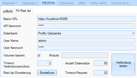 Auf dem Reiter «PROFFIX» können sowohl die Verbindungsdaten für die «pxBook», als auch für die PX Rest Api festgelegt werden