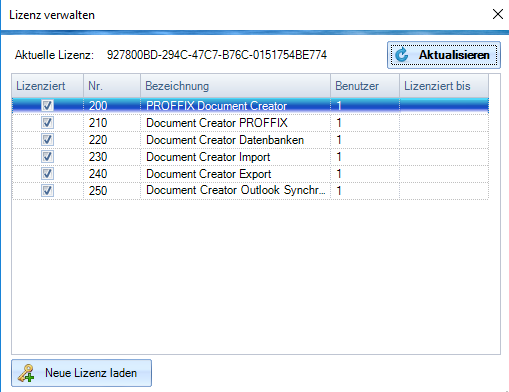 Über den Dialog «Lizenz verwalten» kann die Lizenz aktualisiert (Button «Aktualisieren») oder auch neu eingelesen werden (Button «Neue Lizenz laden»)