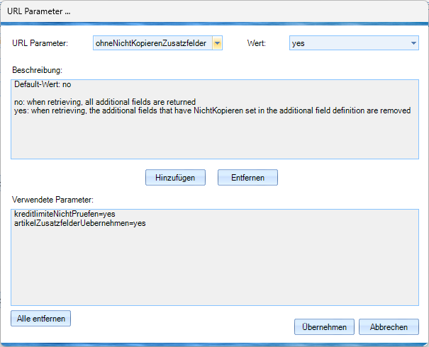 Über den Button «URL Parameter» können bei den PX Rest Api Importen "Dokument-Anlage", "Adress-Anlage, "Artikel-Anlage" und "Dokumentumwandlung" die entsprechenden URL-Parameter über einen Dialog gesetzt werden