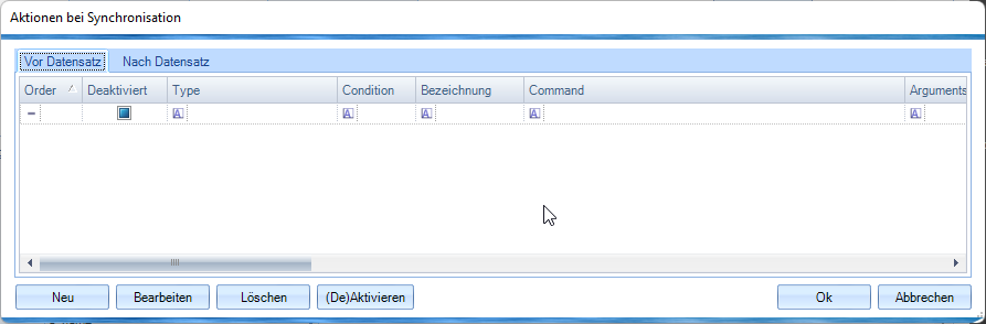 Über den Button «Aktionen» lassen sich diverse Aktionen, für die Zeitpunkt «Vor Datensatz» und «Nach Datensatz» einrichten