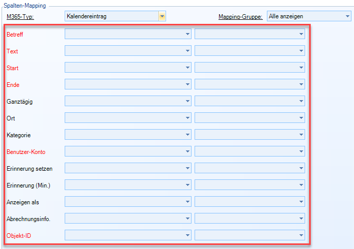 Die rot eingefärbten Felder sind «Pflicht-Felder». D.h. an diesen Feldern muss zwingend ein Mapping erfolgen.